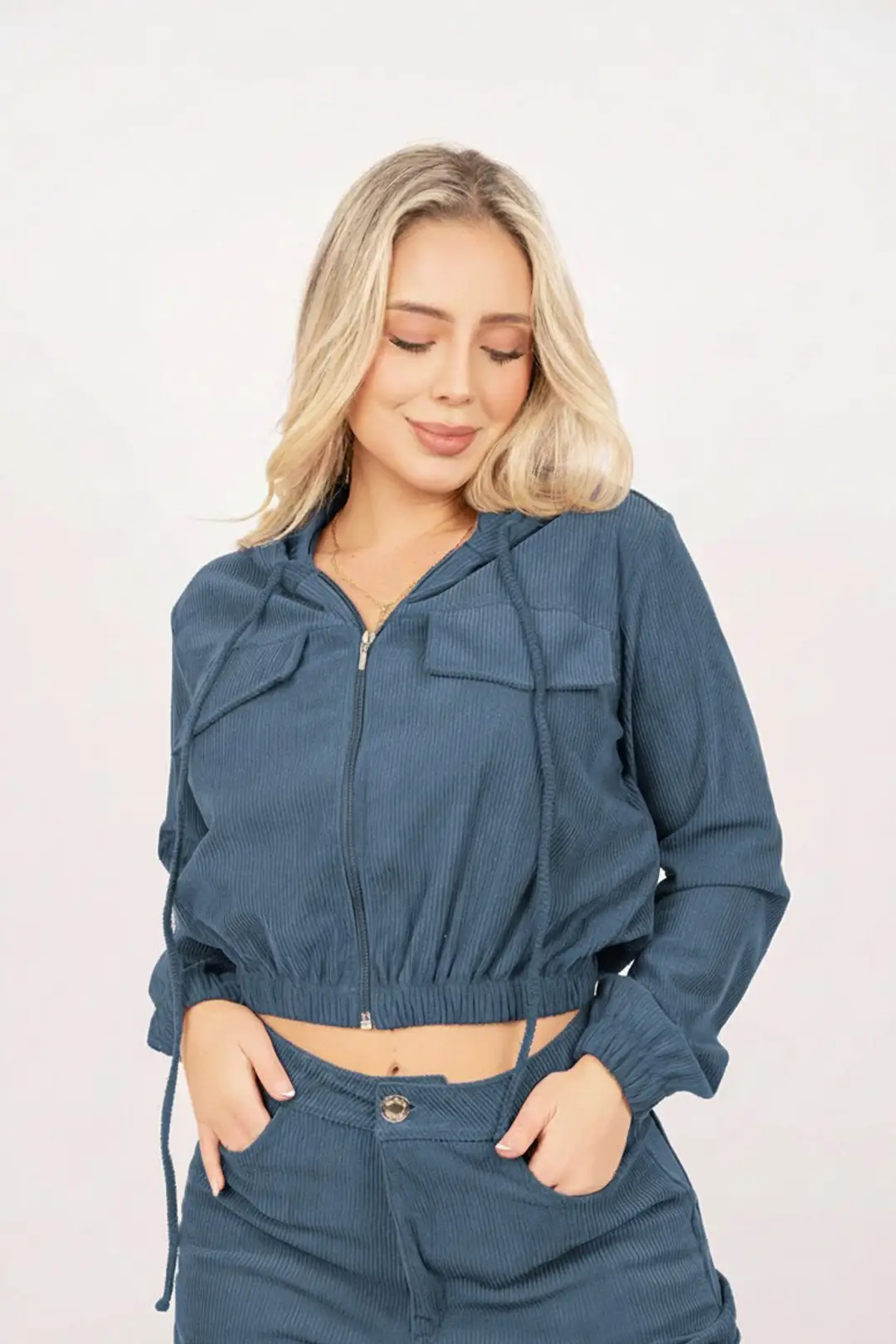 Chaqueta de corduroy con compa y imitacion de bolsillo en la parte delantera.
