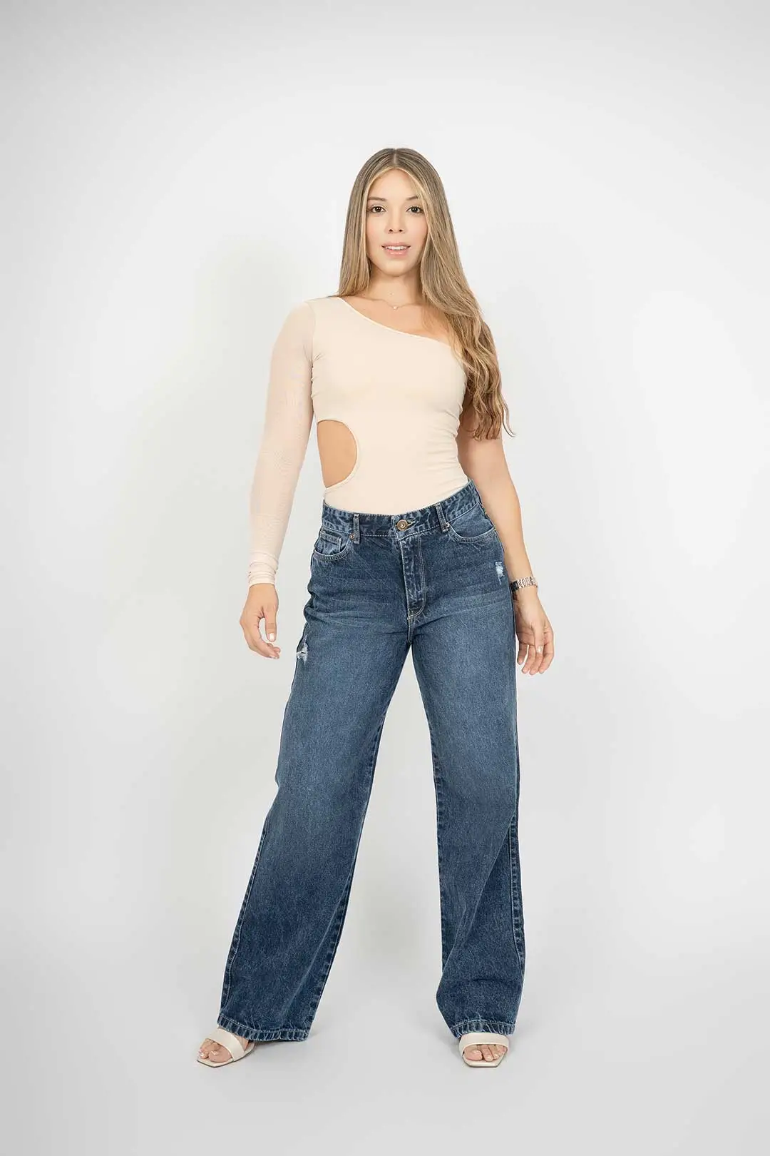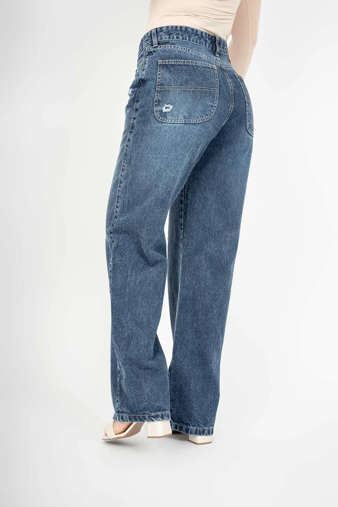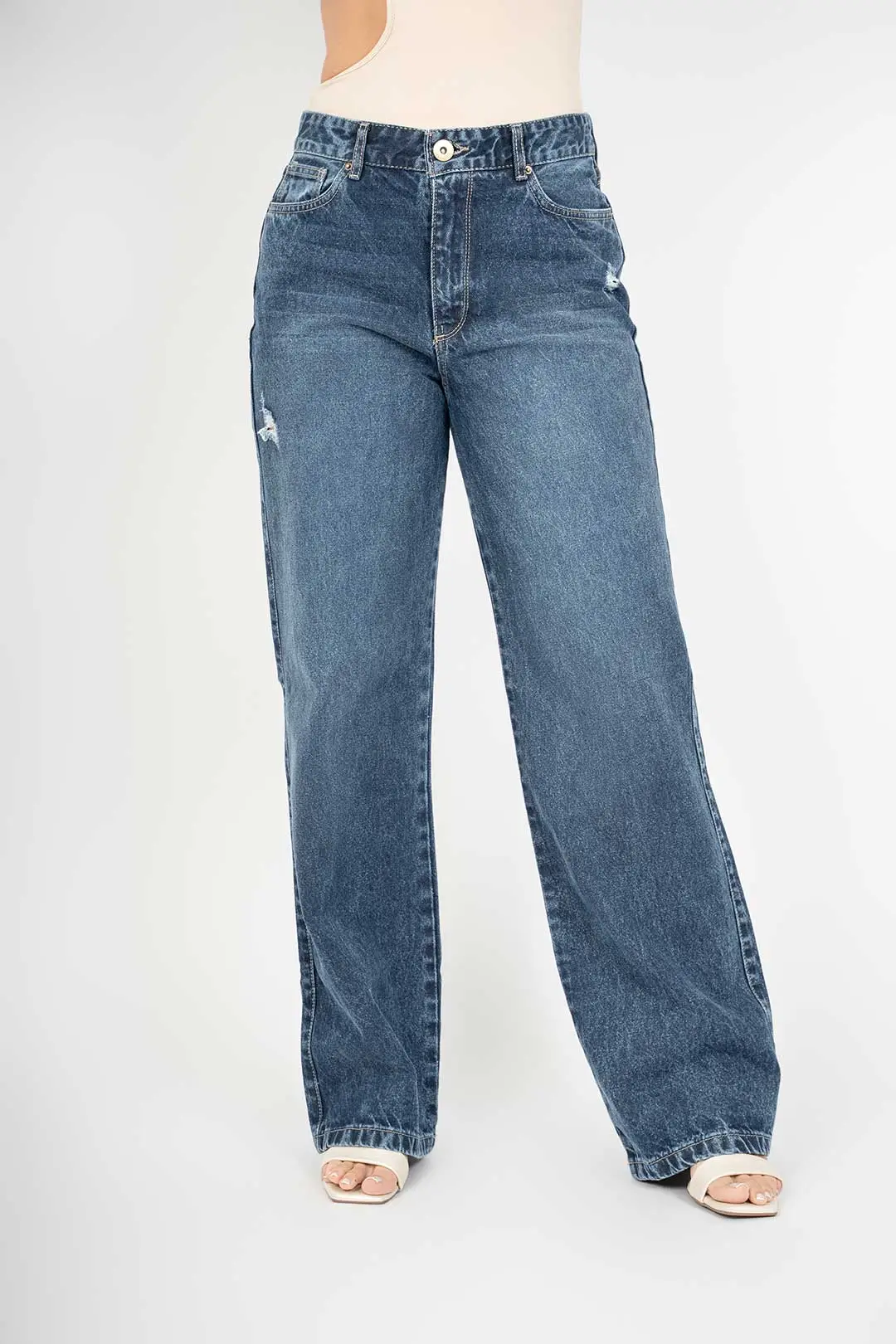 Jean wide clásico rígido con pequeños desgastes en la parte de los bolsillos.