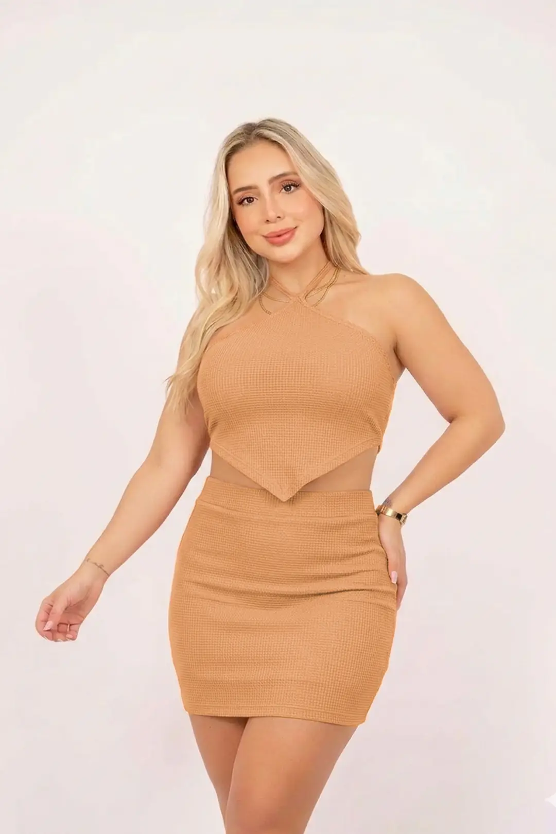 Set en tela galleta que cuenta con falda y crop top.